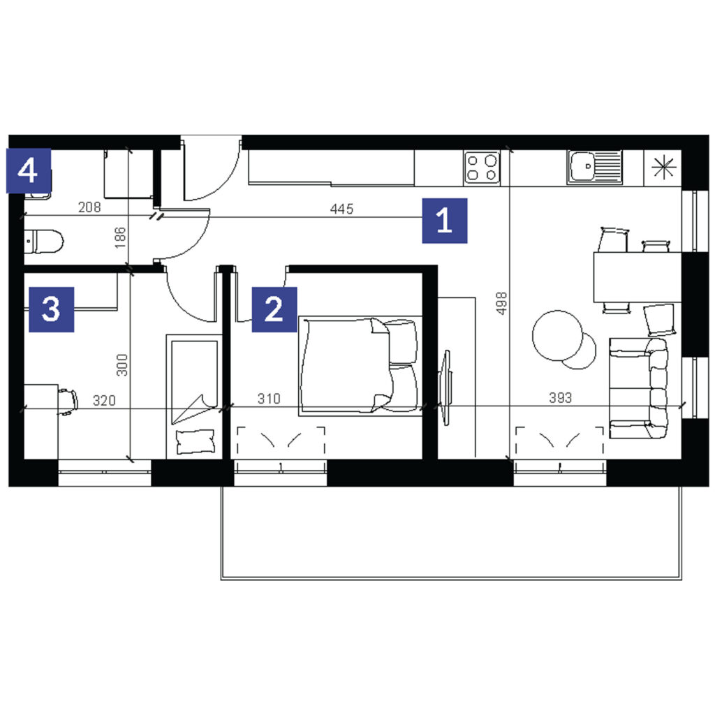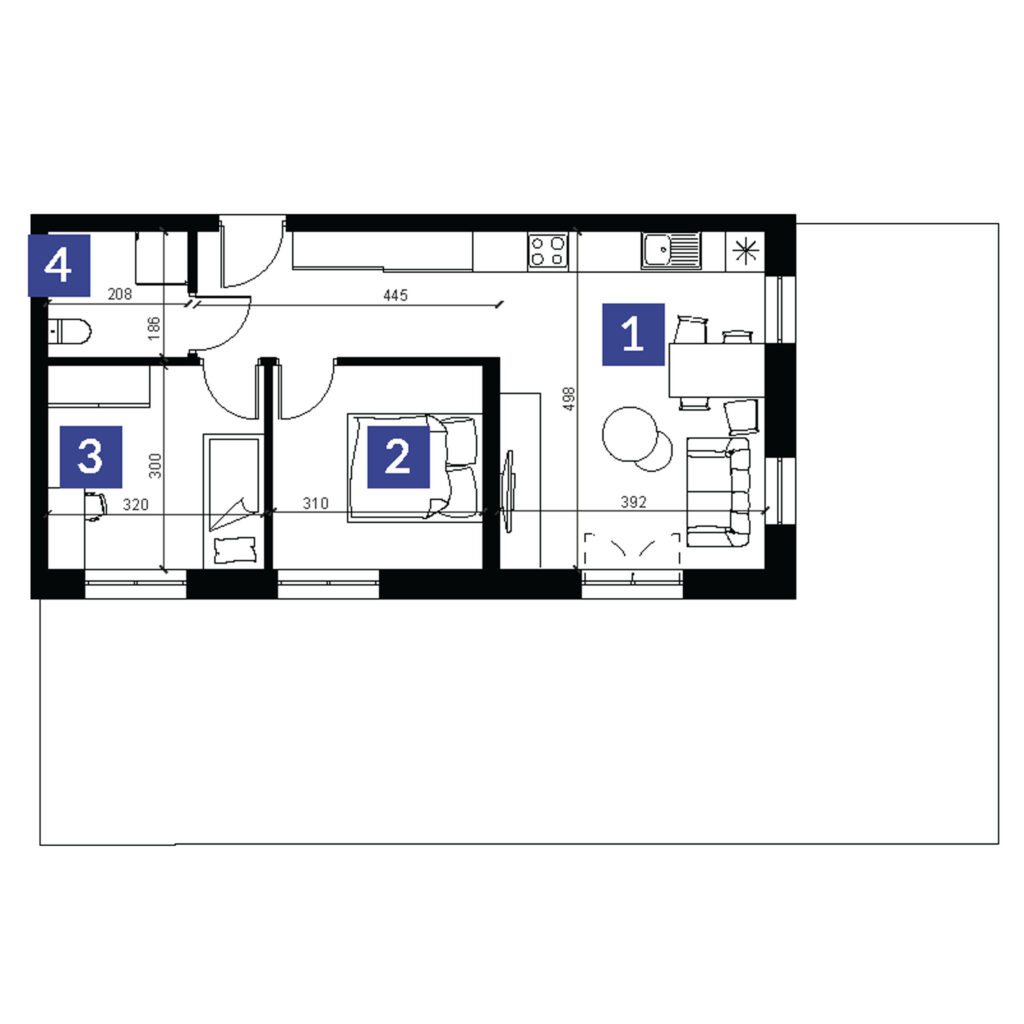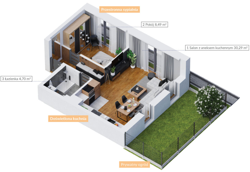 | 1 | Salon z aneksem kuchennym | 30.29 m2 |