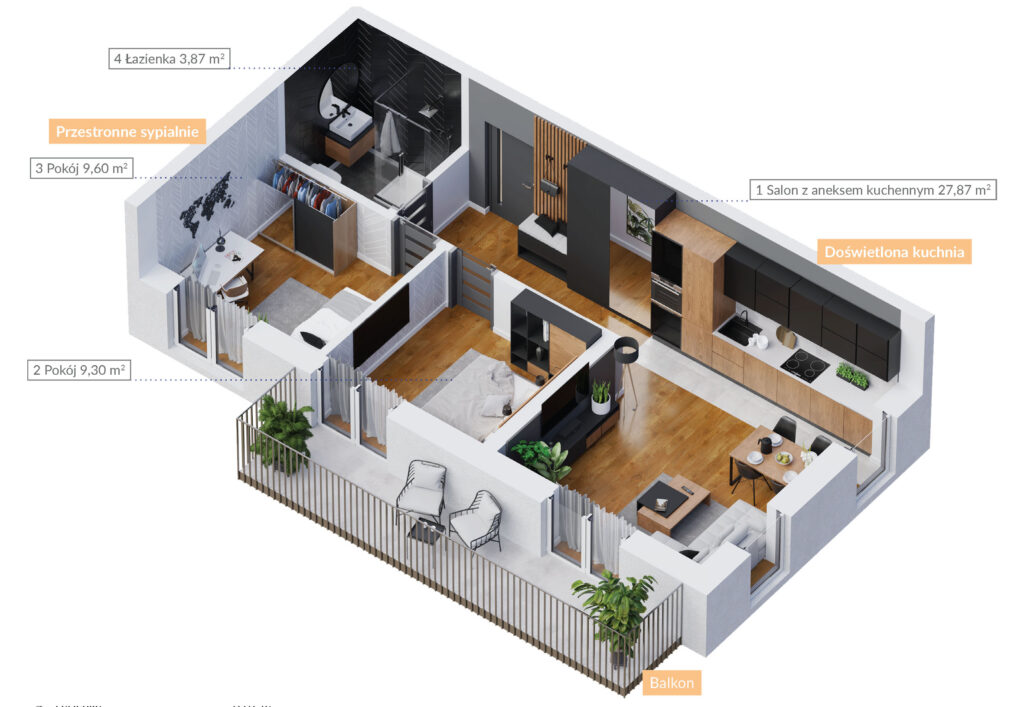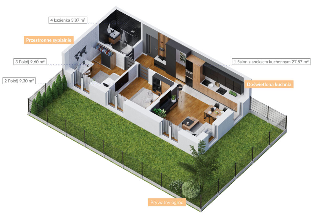 | 1 | Salon z aneksem kuchennym | 27.87 m2 |