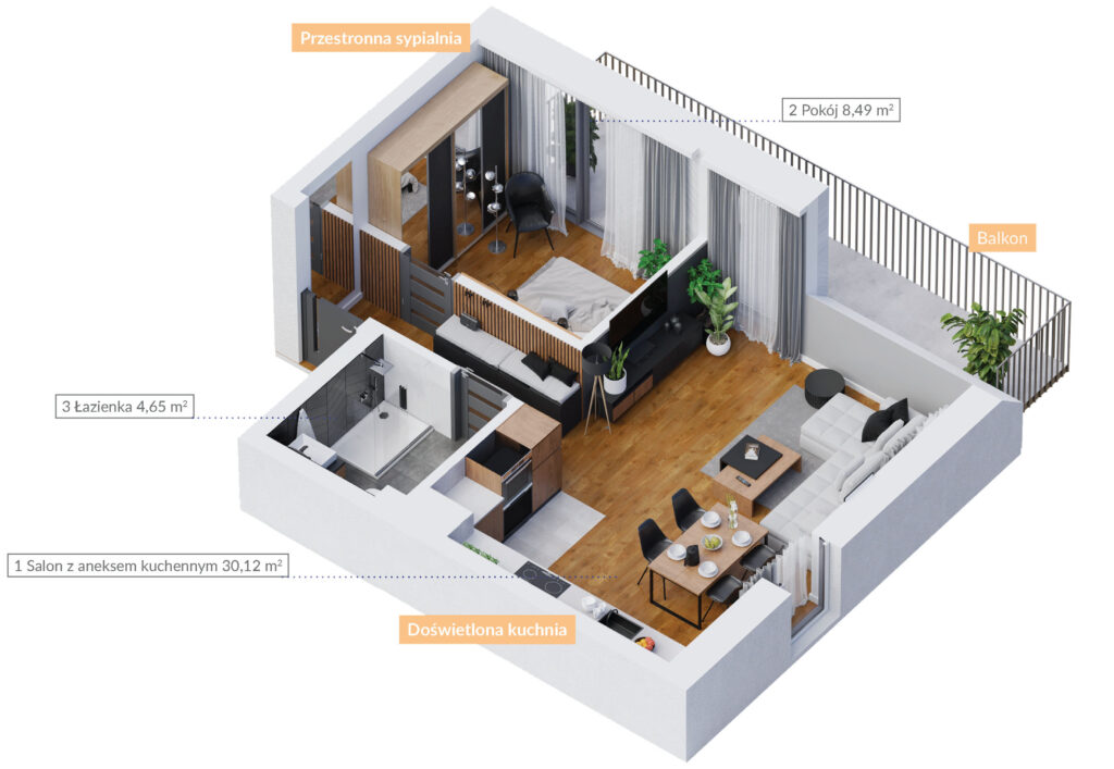 | 1 | Salon z aneksem kuchennym | 30.12 m2 |