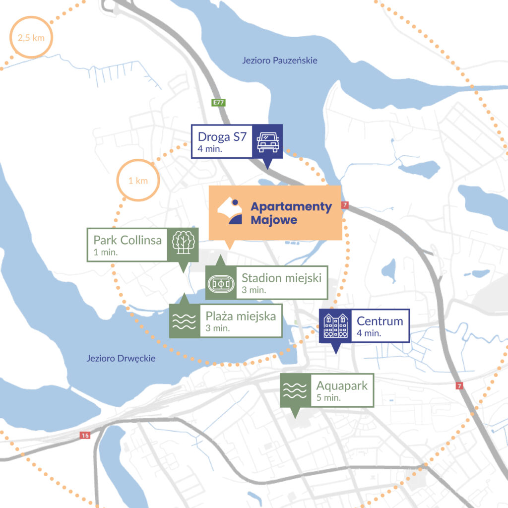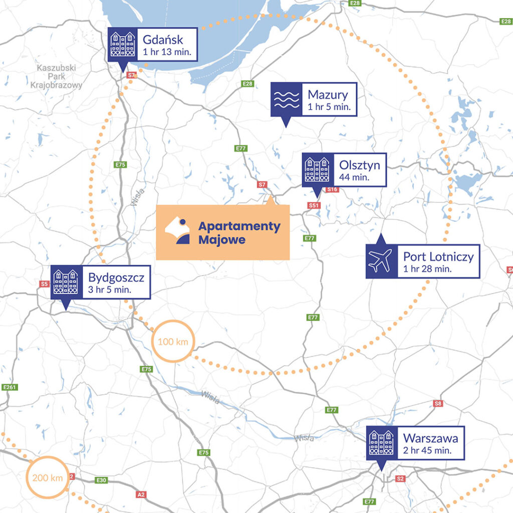 Ostróda to idealne miejsce do zamieszkania. Dlaczego? Położona jest ona pośród lasów i jezior w samym sercu Mazur. Nieocenioną cechą lokalizacji Apartamentów Majowych jest nie tylko piękna przyroda, ale również dobra komunikacja! Do Warszawy dojedziesz w ok. 2.5 H, a do Gdańska w ok. 1 H. Zamieszkując w Apartamentach Majowych, na co dzień będziesz mógł cieszyć się urokami niezwykłego otoczenia oraz być zawsze w bliskim zasięgu tętniących życiem aglomeracji miejskich.